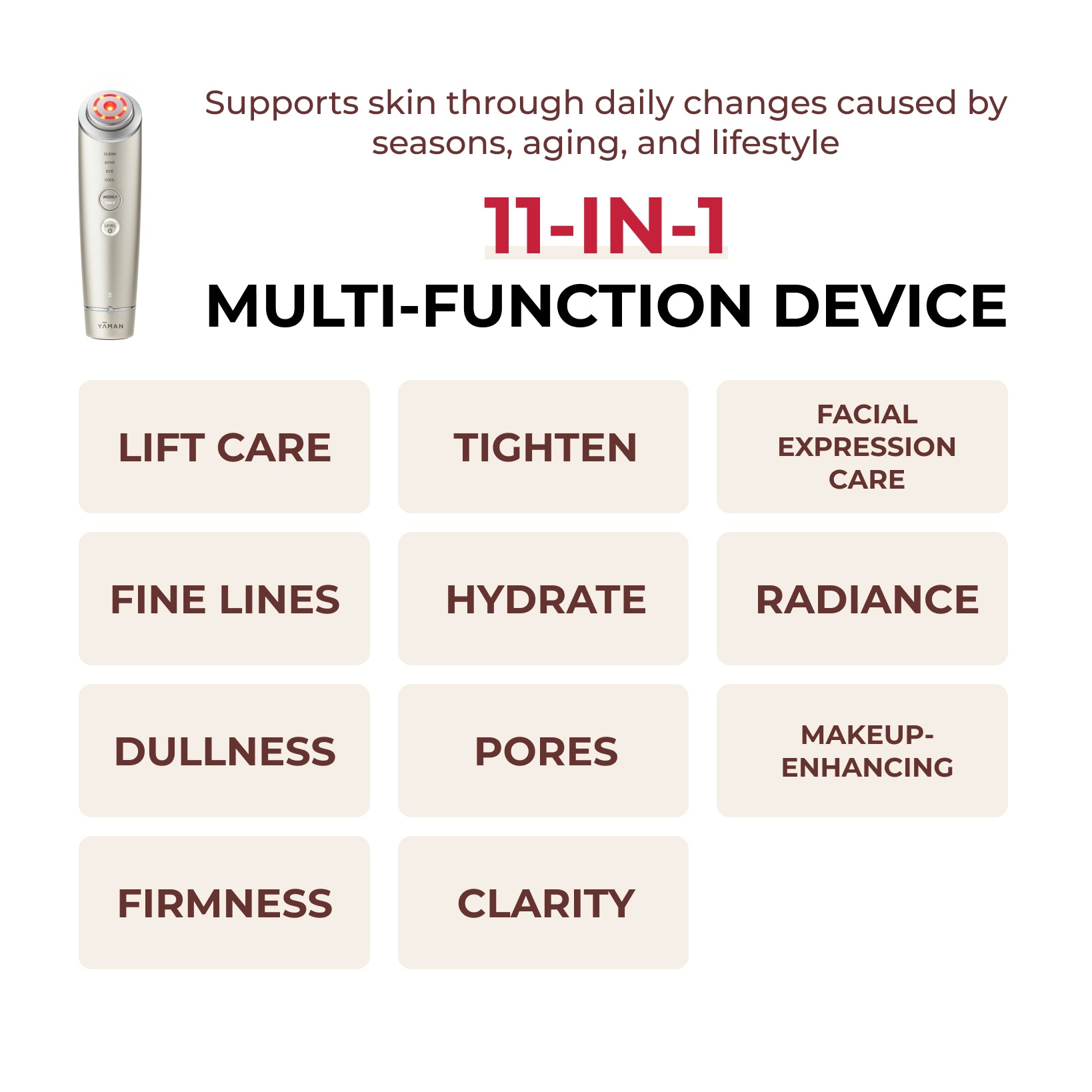 Salon-grade skincare technologies including RF (Radio Frequency), EMS (Electrical Muscle Stimulation), Microcurrent, Ion, DYHP (Dynamic Hyper Pulse), Red & Blue LED, Vibration, and Cool Shot, now in your daily routine.