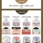 - Technology: RF (1-4MHz), DYHP, EMS , Iontophoresis, Ion Cleansing, Vibration, Red-Blue LED, Microcurrent, Eye Lift, Cooling